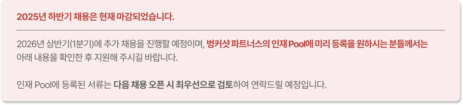 벙커샷 파트너스가 빠르게 성장하며 더 많은 창업팀과 함께하게 되면서, 저희는 새로운 동료를 간절히 찾고 있습니다.